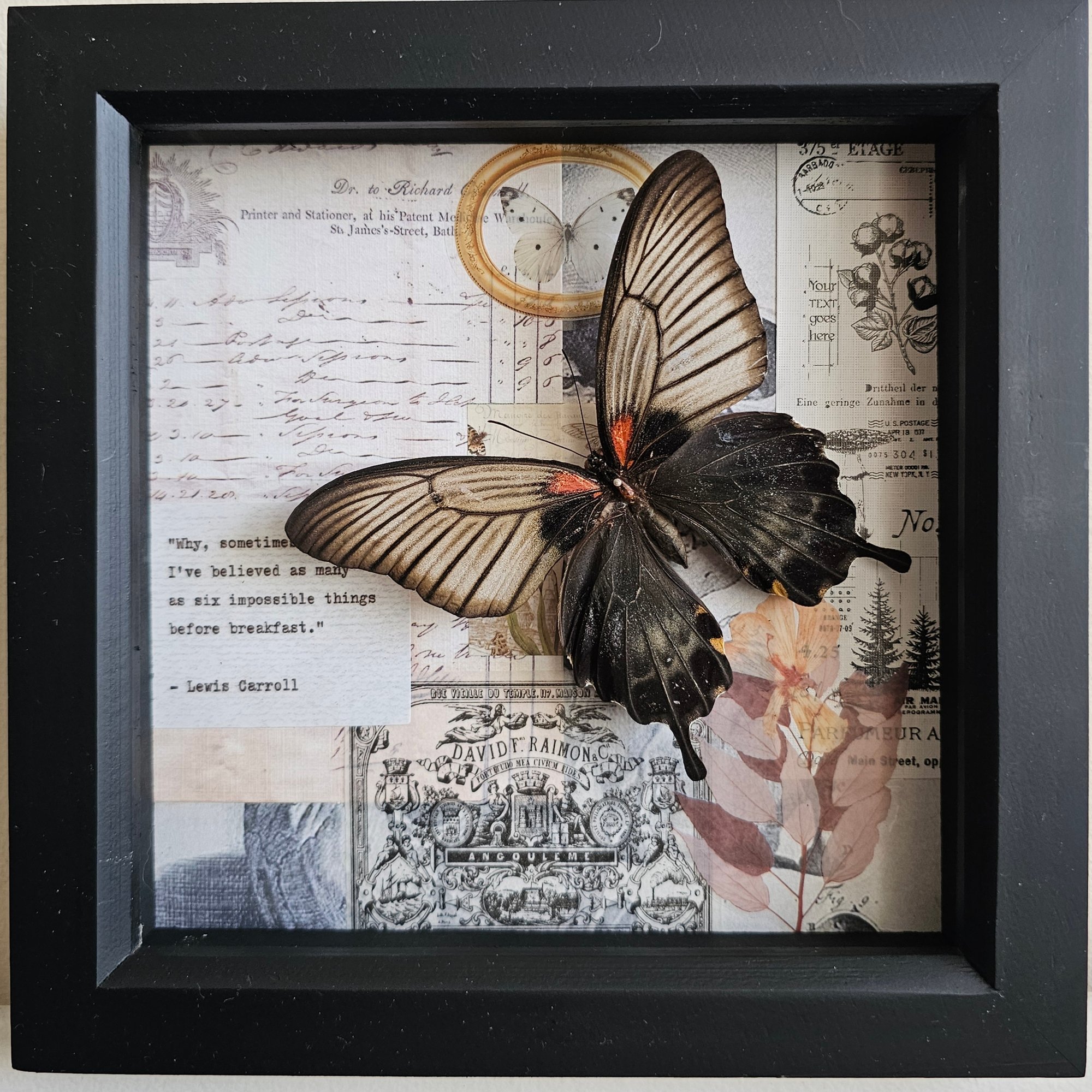 Background: vintage ephemera, stickers, natural history materials, papers and scraps